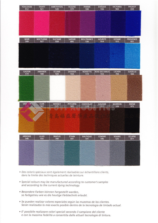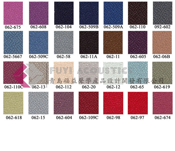 專用于吸聲板、體的表面,作為護(hù)面吸聲裝飾的織物,具有最佳的吸聲、阻燃、防潮、不褪色的功能,并可按照吸聲頻率的要求提供輕質(zhì)、重質(zhì)、超重質(zhì)……等,重量在300g/㎡ -900g/㎡ 范圍內(nèi),也可直接作為吸聲簾幕。